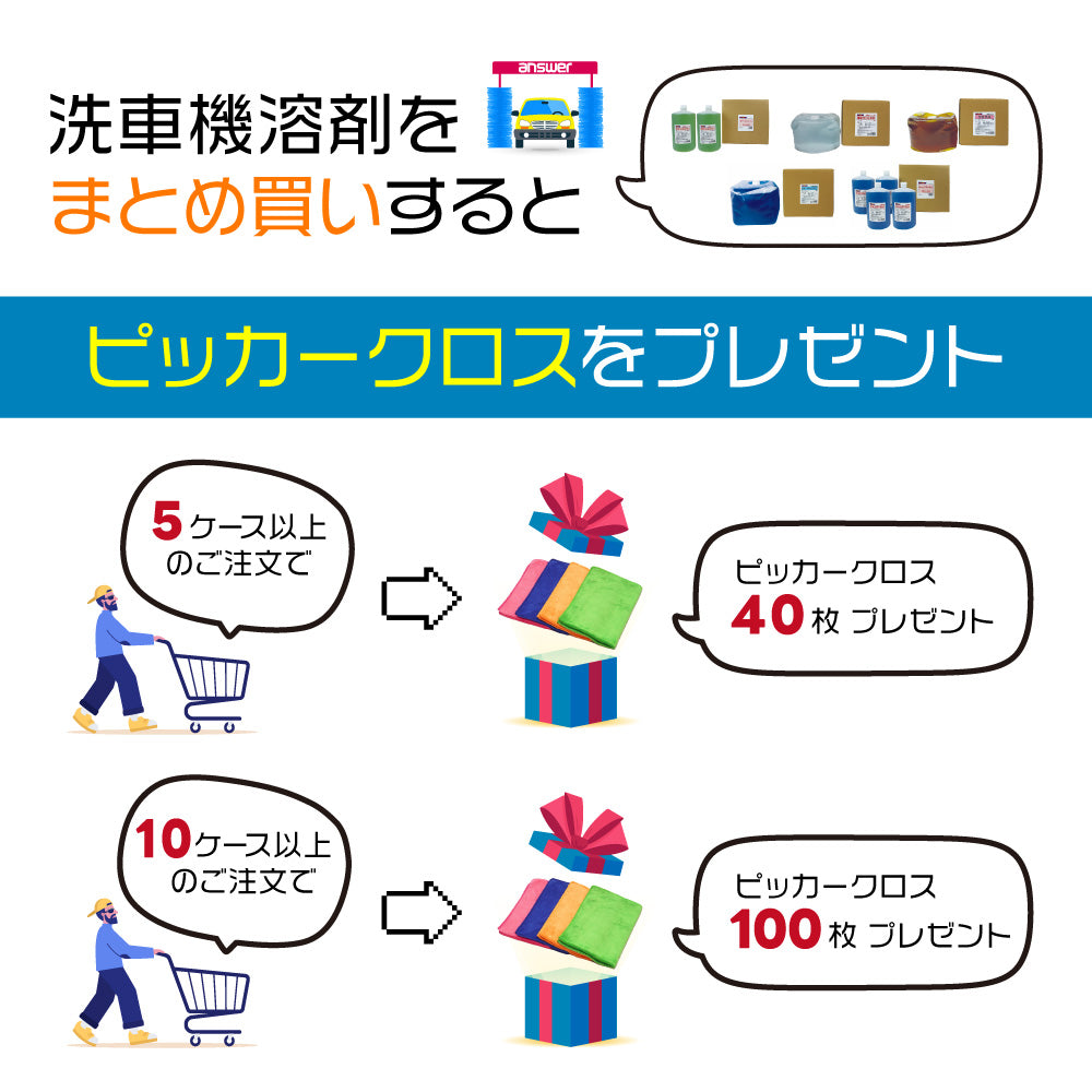 洗車機溶剤をまとめてお買い上げいただくと、大人気ピッカークロス(マイクロファイバータオル)をプレゼントいたします。